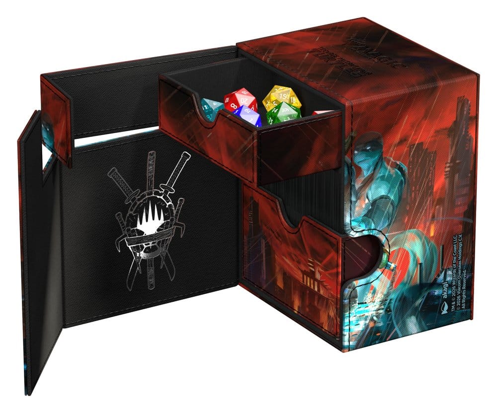 Ultimate Guards Flip'n'Tray 133+ Xenoskin ist eine Premium-MTG-Deck-Box für alle Magic-Formate (Commander/EDH, Modern, Standard, usw.) mit zwei unabhängig voneinander zugänglichen Fächern: eines für 133 doppelt gesleevte Karten in Ultimate Guard-Hüllen* und eines für Würfel und Zubehör. Bedruckt mit offiziell linzensierten Artworks aus dem "Magic: The Gathering | Teenage Mutant Ninja Turtles"-Set garantiert der Flip'n'Tray dank seines widerstandsfähigen Xenoskin-Materials, einer Mikrofaserinnenseite und starker Magnetverschlüsse herausragenden Kartenschutz. Der Flip'n'Tray 133+ kann auch als Aufbewahrungsbox für einen Boulder 100+ verwendet werden, wenn das Kartenfach entfernt wird.